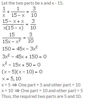 Divide 15 into two parts such that the sum of their reciprocals is \(\frac { 3 }{ 10 }\)