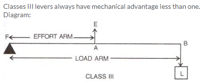 With levers of class III, we do not get gain in force, but we get gain in speed, that is a longer displacement of load is obtained by a smaller displacement of effort.