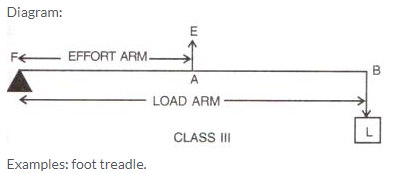 - Class III levers: In these types of levers, the effort E is in between the fulcrum F and the load L and the effort arm is always smaller than the load arm. Example: sugar tongs, forearm used for lifting a load.