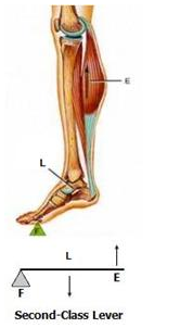Class II lever in raising the weight of the body on toes: The fulcrum is at toes at one end, the load is in the middle and effort by muscles is at the other end.