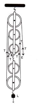 Here the load L is balance by the tension in two segments of the string and the effort E balances the tension T at the free end, so