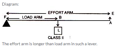 - Class II levers: In these types of levers, the load L is in between the effort E and the fulcrum F. The effort arm is thus always longer than the load arm. Example: a nut cracker, a bottle opener.