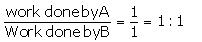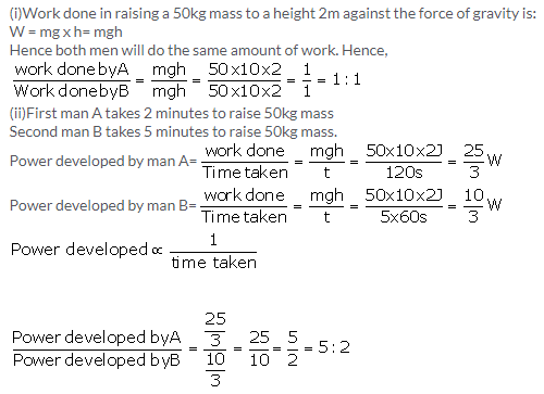 Example: If a coolie A takes 1 minute to lift a load to the roof of a bus, while another coolie B takes 2 minutes to lift the same load to the roof of the same bus, the work done by both the coolies is the same, but the power spent by the coolie A is twice the power spent by the coolie B because the coolie A does work at a faster rate.