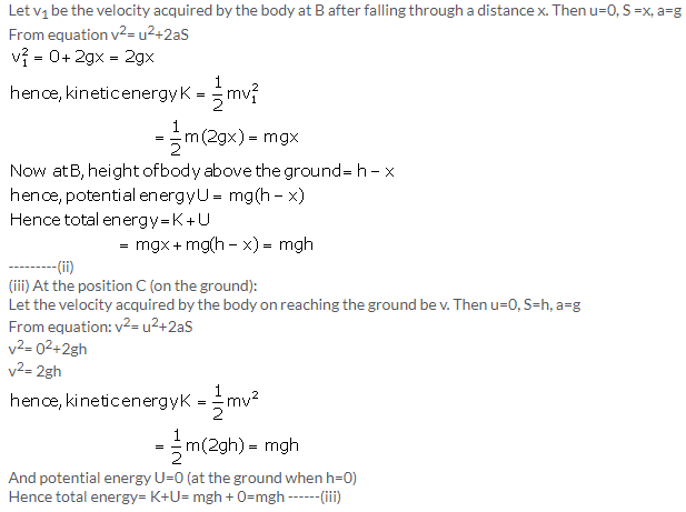 Let a body of mass m be falling freely under gravity from a height h above the ground (i.e., from position A). Let us now calculate the sum of kinetic energy K and potential energy U at various positions, say at A (at height h above the ground), at B (when it has fallen through a distance x) and at C (on the ground).