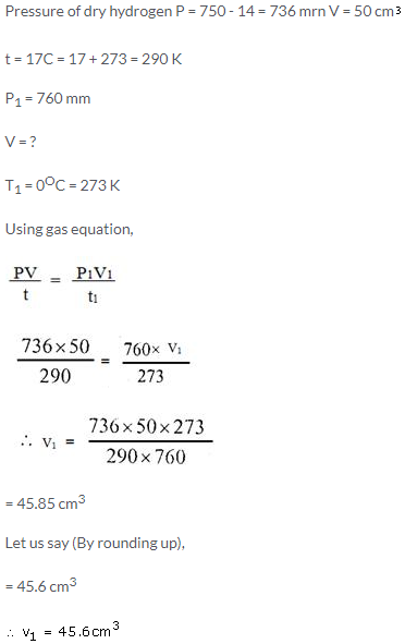 50 cm3 of hydrogen is collected over water at 17°C and 750 mmHg pressure. Calculate the volume of a dry gas at STP. The water vapour pressure at 17°C is 14 mmHg.
