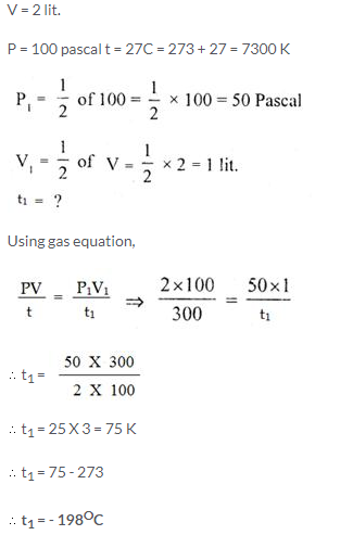 A certain mass of a gas occupies 2 litres at 27°C and 100 Pa. Find the temperature when volume and pressure become half of their initial values.