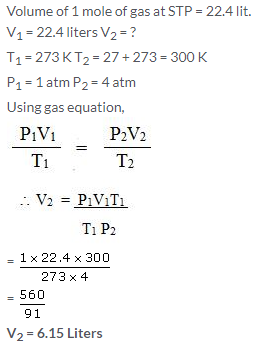 Calculate the volume occupied by 2 g of hydrogen at 27°C and 4 atmosphere pressure if at STP it occupies 22.4 litres.