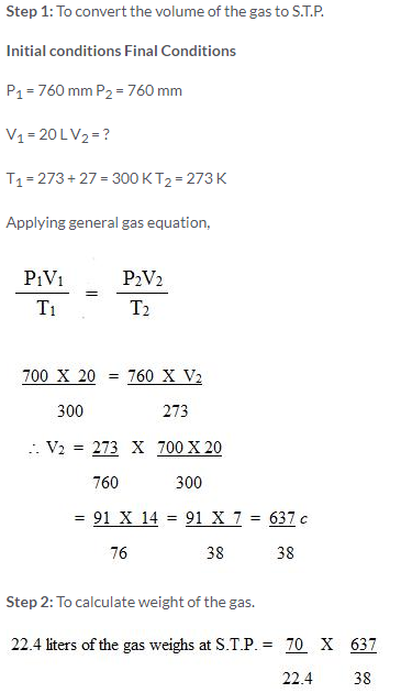 22.4 litres of a gas weighs 70 g at STP. Calculate the weight of the gas if it occupies a volume of 20 litres at 27°C and 700 mmHg of pressure.