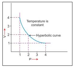 2. V vs P : Variation in volume (V) plotted against pressure (P) at a constant temperature, a hyperbolic curve in the first quadrant is obtained.
