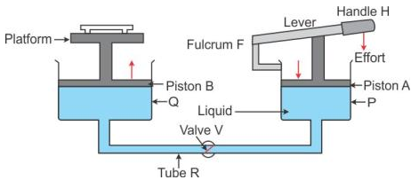 The principle of a hydraulic machine is that a small force applied on a smaller piston is transmitted to produce a large force on the bigger piston.