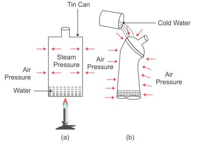 Take a thin can fitted with an airtight stopper. The stopper is removed and a small quantity of water is boiled in the can. Gradually the steam occupies the entire space of can by expelling the air from it [Fig (a)]. Then stopper is then tightly replaced and simultaneously the flame beneath the can is removed. Cold water is then poured over the can.