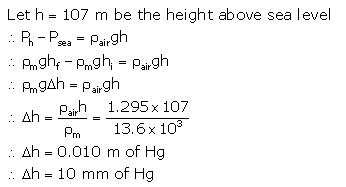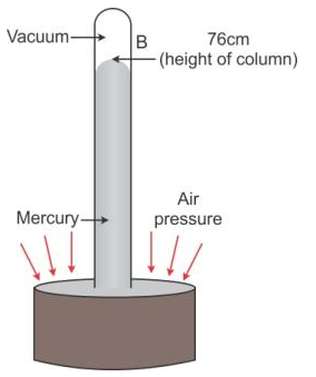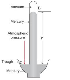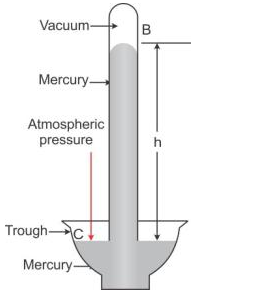 In given figure, at all points such as C on the surface of mercury in trough, only the atmospheric pressure acts. When the mercury level in the tube becomes stationary, the pressure inside tube at the point A, which is at the level of point C, must be same as that at the point C. The pressure at point A is due to the weight (or thrust) of the mercury column AB above it. Thus, the vertical height of the mercury column from the mercury surface in trough to the level in tube is a measure of the atmospheric pressure.