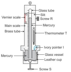 To measure the atmospheric pressure, first the leather cup is raised up or lowered down with the help of the screw S so that the ivory pointer I just touches the mercury level in the glass vessel. The position of the mercury level in the barometer tube is noted with the help of main scale and the vernier scale. The sum of the vernier scale reading to the main scale reading gives the barometric height.