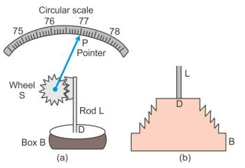 Construction: Figure above shows the main parts of an aneroid barometer. It consists of a metallic box B which is partially evacuated. The top D of the box is springy and corrugated in form of a diaphragm as shown. At the middle of diaphragm, there is a thin rod L toothed at its upper end. The teeth of rod fit well into the teeth of a wheel S attached with a pointer P which can slide over a circular scale. The circular scale is initially calibrated with a standard barometer so as to read the atmospheric pressure directly in terms of the barometric height.