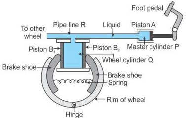 Working: To apply brakes, the foot pedal is pressed due to which pressure is exerted on the liquid in the master cylinder P, so liquid runs out from the master cylinder P to the wheel cylinder Q. As a result, the pressure is transmitted equally and undiminished through the liquid to the pistons B1and B2 of the wheel cylinder. Therefore, the pistons B1 and B2 get pushed outwards and brake shoes get pressed against the rim of the wheel due to which the motion of the vehicle retards. Due to transmission of pressure through the liquid, equal pressure is exerted on all the wheels of the vehicle connected to the pipe line R.