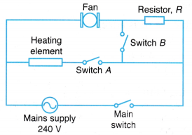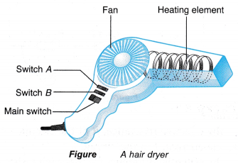 - Figure shows a hairdryer with two switches, A and B.