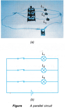- Figure shows a parallel circuit, where the three bulbs, L1 , L2 and L3 and their respective switches are connected with their ends joined at two common points before the ends are connected to a cell.