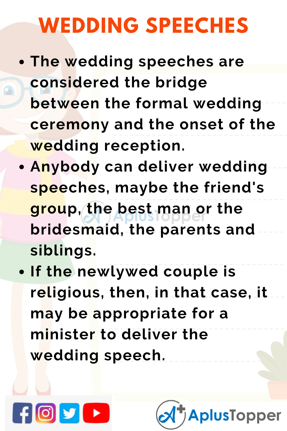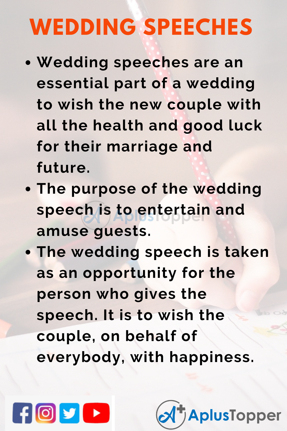 - Wedding speeches are an essential part of a wedding to wish the new couple with all the health and good luck for their marriage and future.