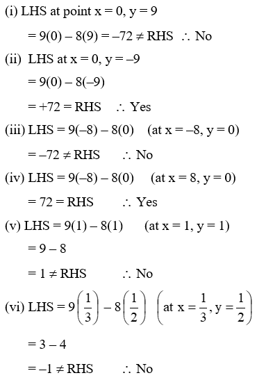 Example 4: Check the following value of x & y are solution of equation 9x – 8y = 72 or not