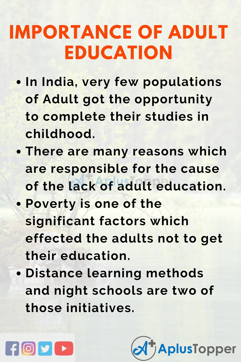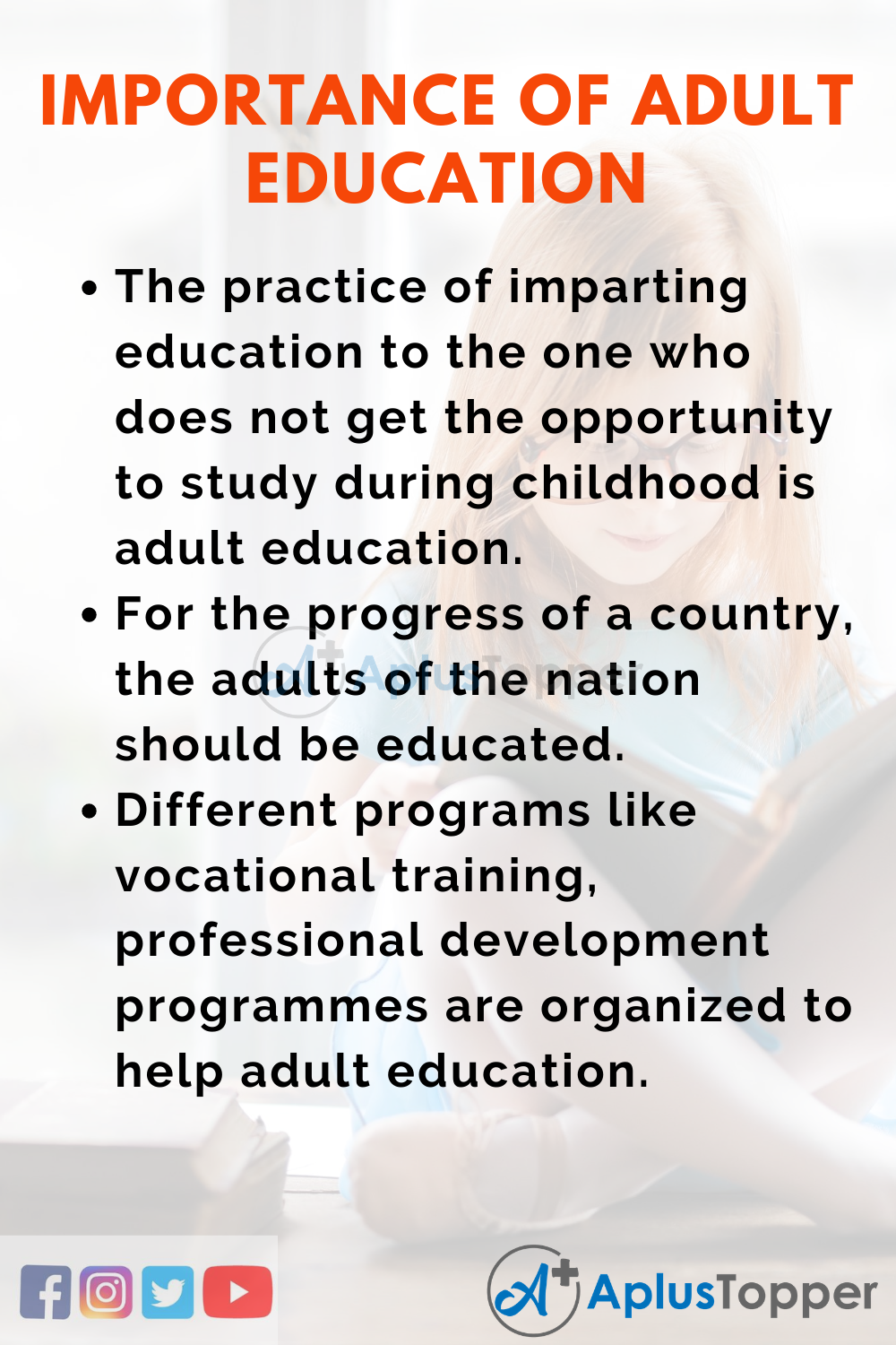 A Long Speech On Importance Of Adult Education is helpful to students of classes 7, 8, 9, 10, 11 and 12. A Short Speech On Importance Of Adult Education is helpful to students of classes 1, 2, 3, 4, 5 and 6.