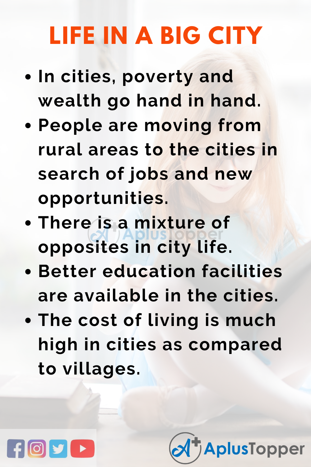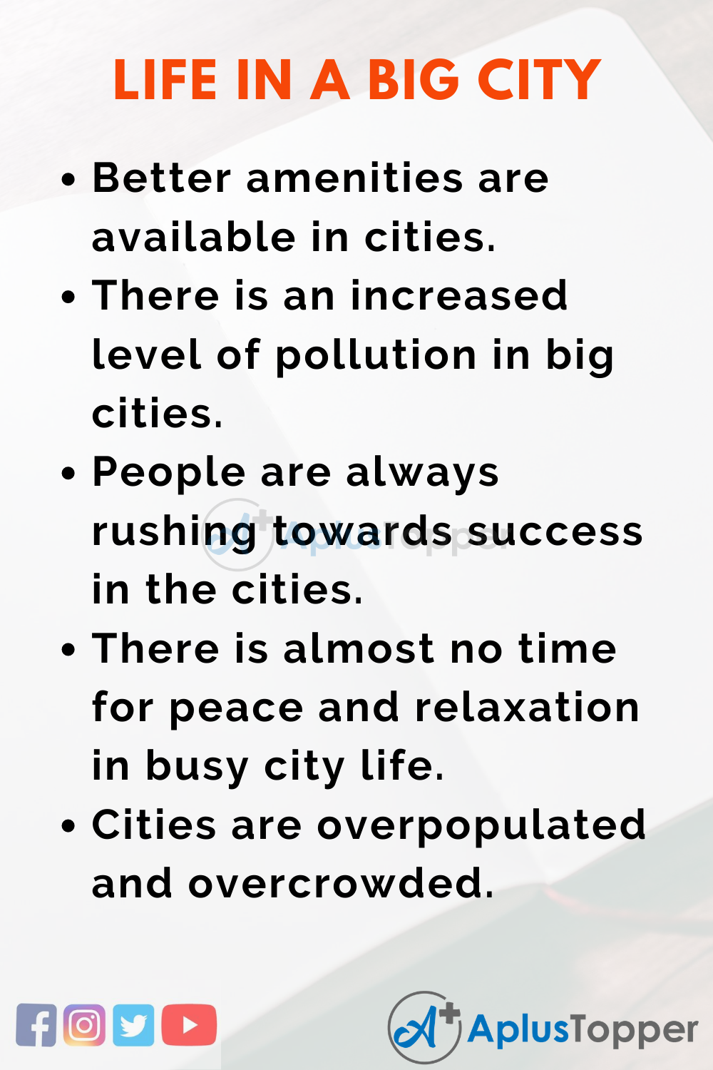 Speech On Life In A Big City: Big city life can be described as flowing, fast, hectic, and mostly cut off from nature. Everyone is running towards gaining fame and recognition. Unemployed people are searching for jobs and opportunities. Students are busy in their daily rush of submitting assignments and getting better grades. Overall, big city life is busy, and the fittest man can get past all the obstacles and survive in the busy big city life.