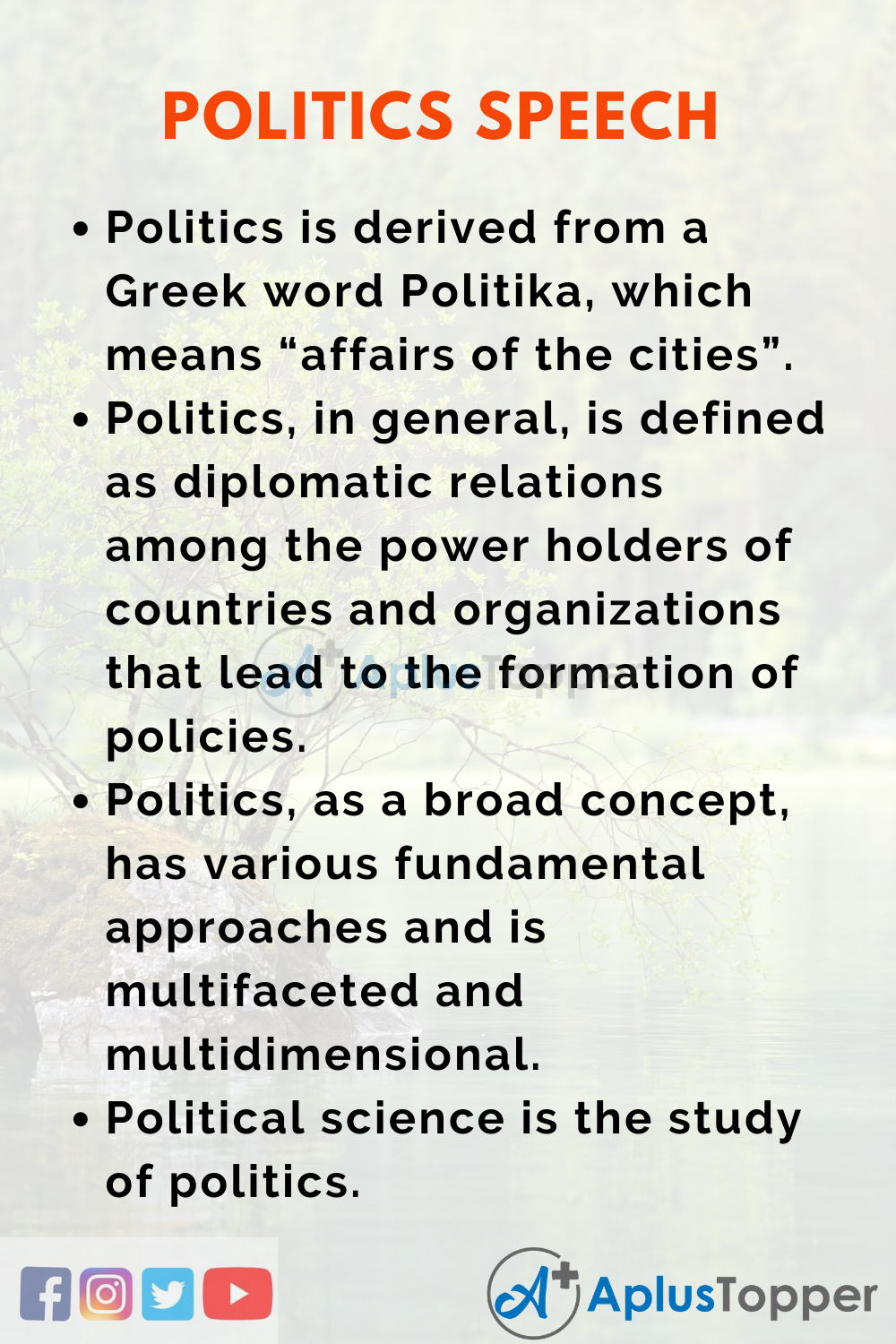 Speech on Politics: Politics is a multidimensional concept. It is a term related to affairs among countries and organizations. We can also call politics as the science of governance.