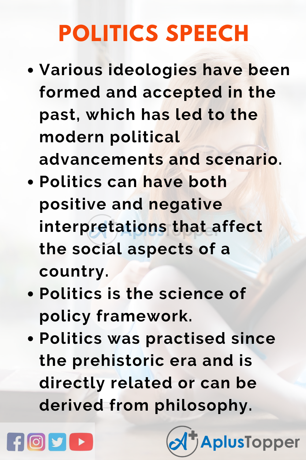 A Long Speech On Politics is helpful to students of classes 7, 8, 9, 10, 11 and 12. A Short Speech On Politics is helpful to students of classes 1, 2, 3, 4, 5 and 6.