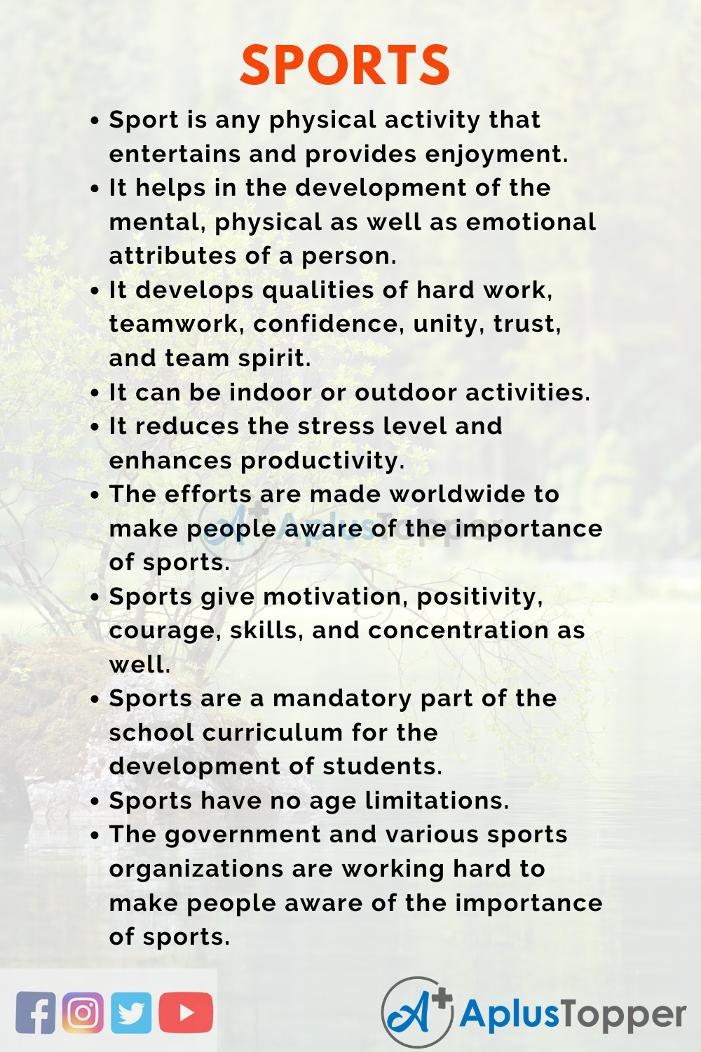 - Sports give motivation, positivity, courage, skills, and concentration as well.