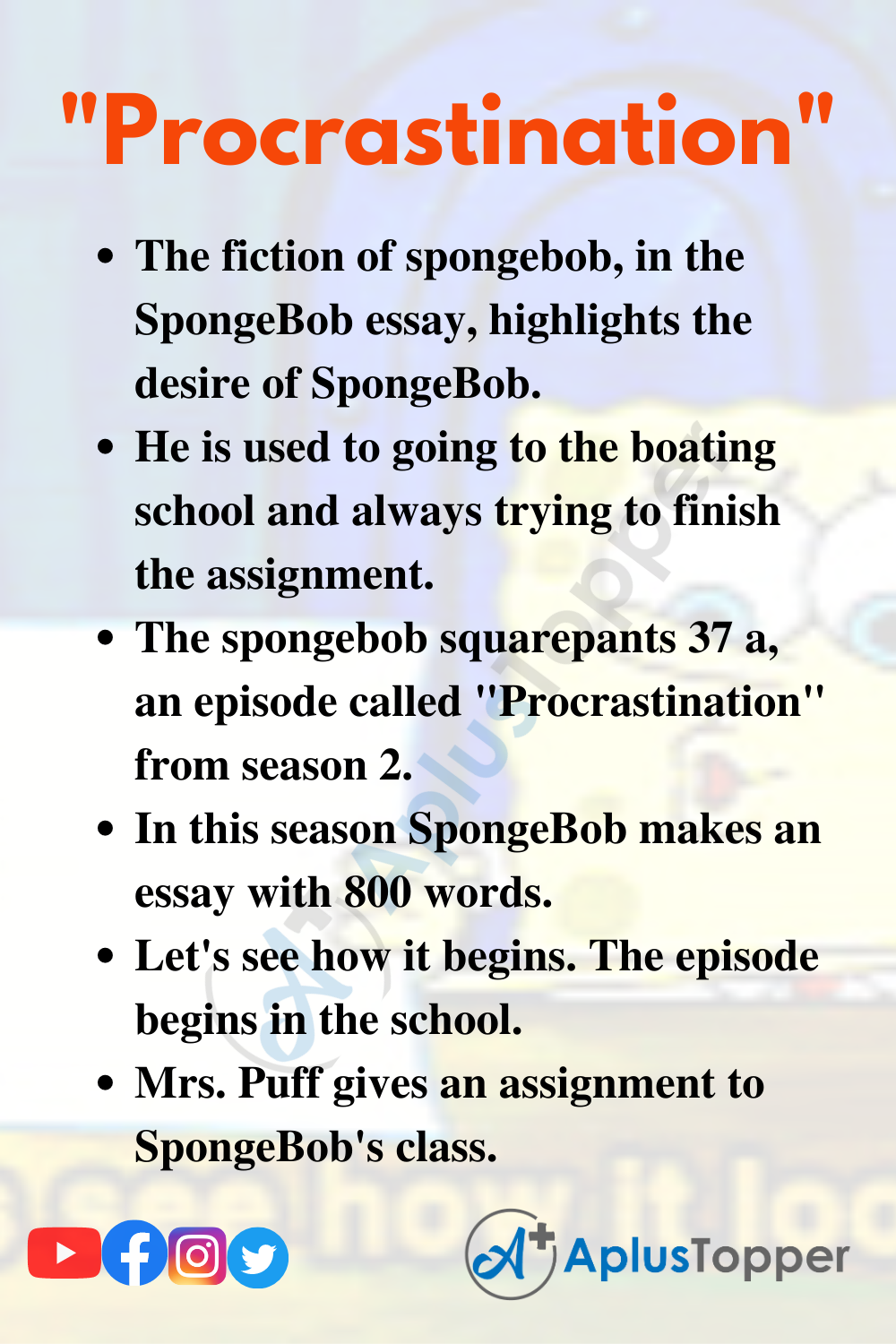 The fiction of spongebob, in the SpongeBob essay, highlights the desire of SpongeBob. He is used to going to the boating school and always trying to finish the assignment. The spongebob squarepants 37 a, an episode called “Procrastination” from season 2. In this season SpongeBob makes an essay with 800 words. Let’s see how it begins. The episode begins in the school.