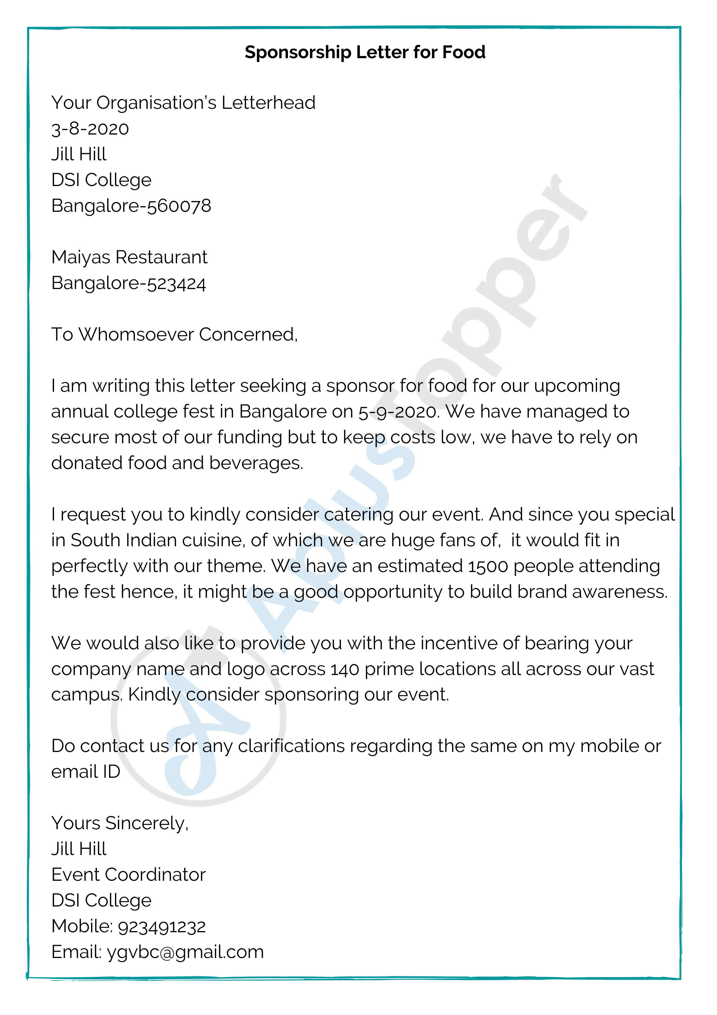 - Lastly, a sponsorship letter is a formal letter, hence, use all formal letter writing conventions. Also, proof-read the letter for factual or grammatical errors.
