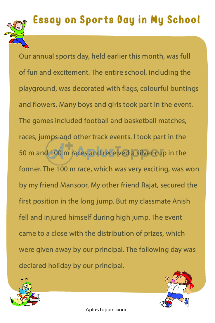 Sports Day in My School Essay: Our annual sports day, held earlier this month, was full of fun and excitement. The entire school, including the playground, was decorated with flags, colourful buntings and flowers. Many boys and girls took part in the event.