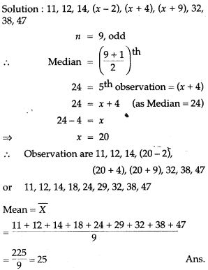 Question 1. The median of the following observations 11, 12, 14, (x – 2), (x + 4), (x + 9), 32, 38, 47 arranged in ascending order is 24. Find the value of x and hence find the mean.