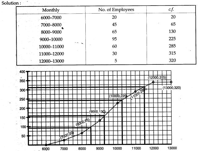 Draw an ogive of the given distribution on a graph sheet taking 2 cm = Rs. 1000 on one axis and 2 cm = 50 employees on the other axis. From the graph determine: