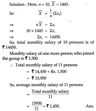 Question 3. The mean monthly salary of 10 members of a group is Rs.1,445, one more member whose monthly salary is Rs.1,500 has joined the group. Find the mean monthly salary of 11 members of the group.