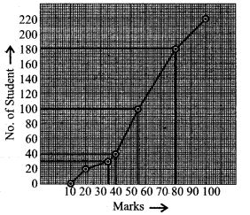 Draw an ogive for the given distribution taking 2 cm = 10 marks on one axis and 2 cm = 20 students on the other axis. Using the graph, determine: