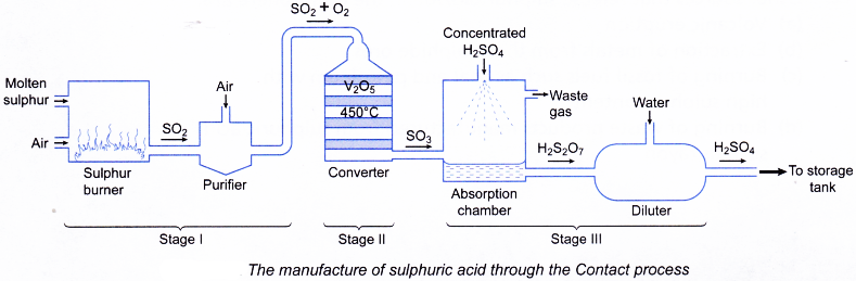 H2S2O7(l) + H2O(l) → 2H2SO4(aq) - The diagrammatic steps for the production of sulphuric acid is shown in Figure.