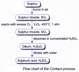 (b) produces acidic fume which is difficult to condense and may pollute the air - The manufacture of sulphuric acid in industry is shown in the flow chart in Figure.