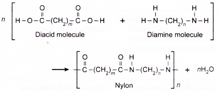 (c) Diacid molecules and diamine molecules undergo condensation reaction to form nylon and water.