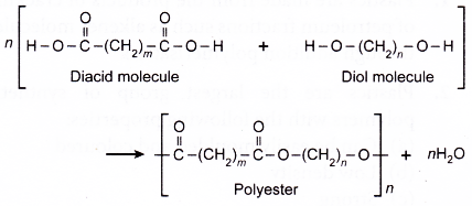 (c) When many diacid molecules condense with diol molecules, a polyester and water are formed.