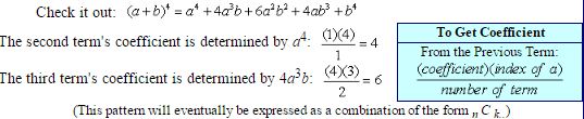 7. The coefficients of the middle terms form an interesting (but perhaps not easily recognized) pattern where each coefficient can be determined from the previous term. The coefficient is the product of the previous term’s coefficient and a’s index, divided by the number of that previous term.