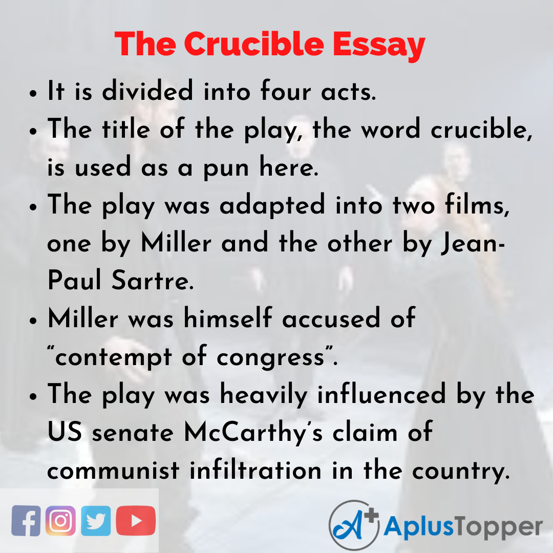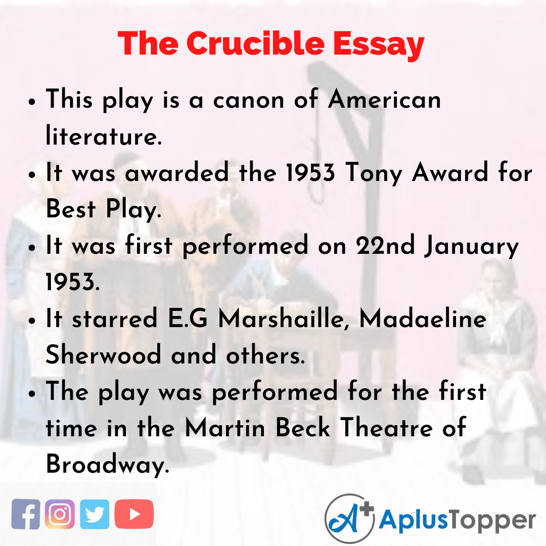 Short Essay on The Crucible is usually given to classes 1, 2, 3, 4, 5, and 6.