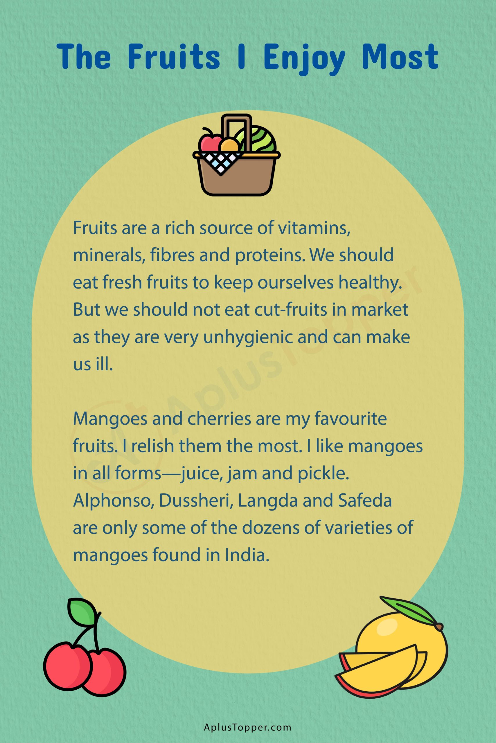 The Fruits I Enjoy Most Essay: Our country has plenty of fruits, which are available in all shapes, sizes and colours. Summers or winters, there is always a wide variety of fruits to choose from. There is also a great variety in their colours and in the way they smell and taste. Mangoes, peaches, papayas, plums, cherries, bananas, grapes, melons, we get them all here!