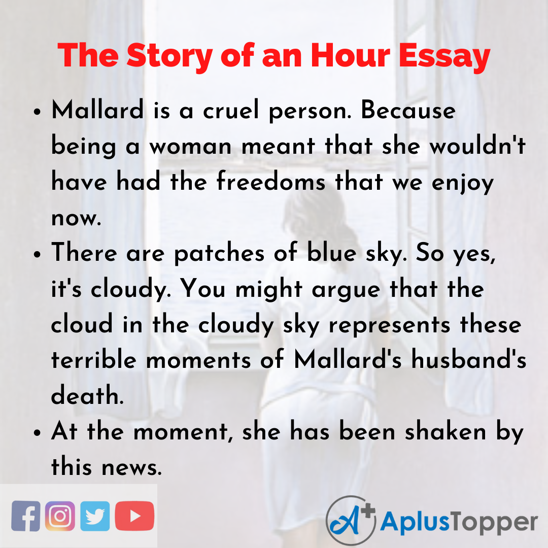 The Story of an Hour Essay: We will talk through “The Story of an Hour” by Kate Chopin. So the title The Story of an Hour story refers to the form of the text. It is a short story. It’s fictional. But it also relates to the Story that Mrs. Mallard tells herself that being her the Story about her life post her husband’s death is something to look forward to this new beginning, and what we learn is that it’s just a fantasy in the end.