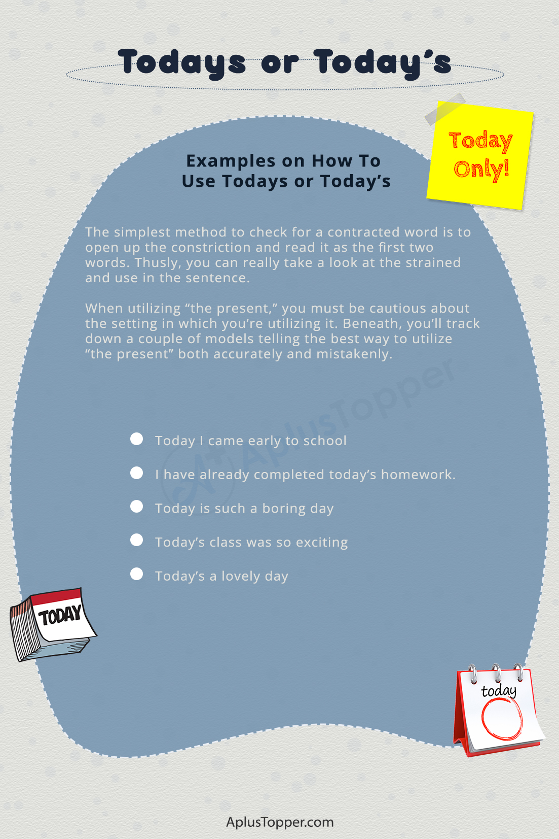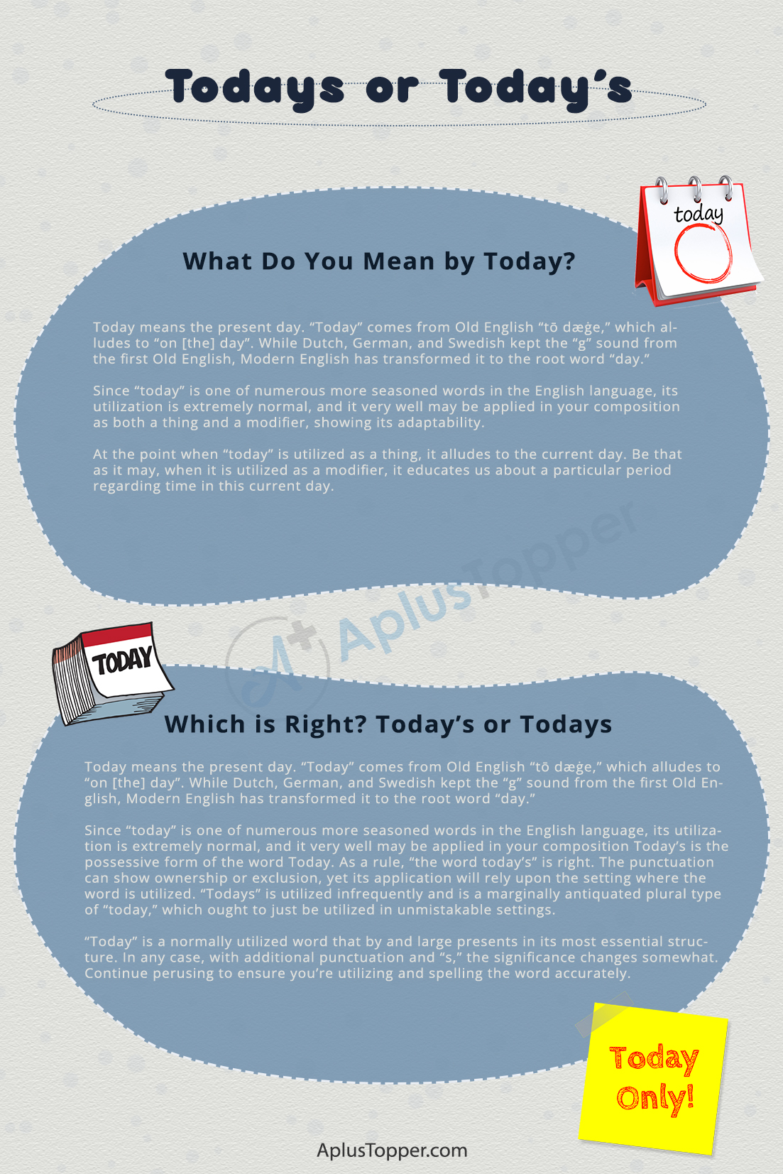 Today’s is the possessive form of the word Today. As a rule, “the word today’s” is right. The punctuation can show ownership or exclusion, yet its application will rely upon the setting where the word is utilized. “Todays” is utilized infrequently and is a marginally antiquated plural type of “today,” which ought to just be utilized in unmistakable settings.