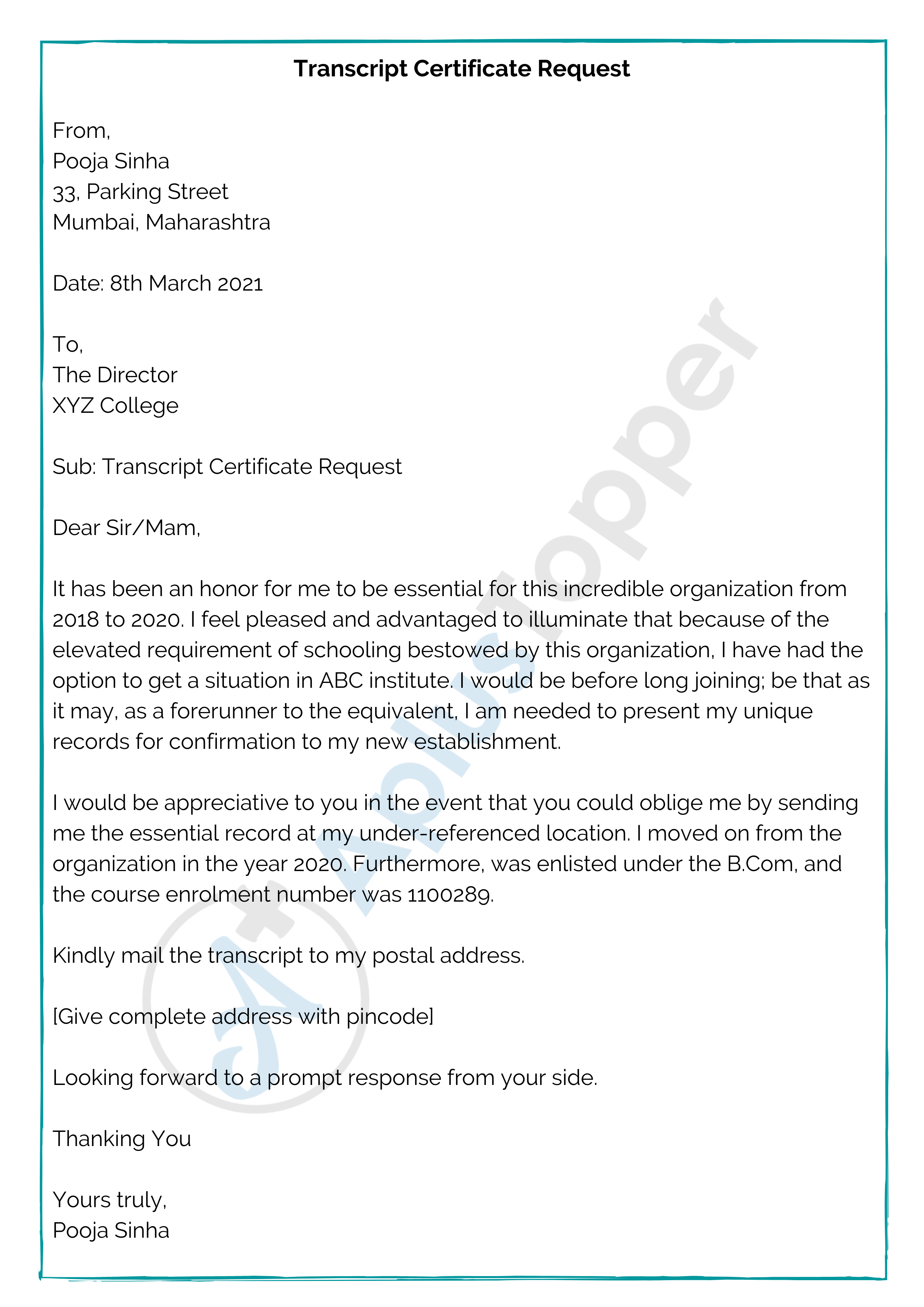 | From, Pooja Sinha 33, Parking Street Mumbai, Maharashtra Date: 8th March 2021 To, The Director XYZ College Subject: Transcript Certificate Request Dear Sir/Mam, It has been an honor for me to be essential for this incredible organization from 2018 to 2020. I feel pleased and advantaged to illuminate that because of the elevated requirement of schooling bestowed by this organization, I have had the option to get a situation in ABC institute. I would be before long joining; be that as it may, as a forerunner to the equivalent, I am needed to present my unique records for confirmation to my new establishment. I would be appreciative to you in the event that you could oblige me by sending me the essential record at my under-referenced location. I moved on from the organization in the year 2020. Furthermore, was enlisted under the B.Com, and the course enrolment number was 1100289. Kindly mail the transcript to my postal address. [Give complete address with pincode] Looking forward to a prompt response from your side. Thanking You Yours truly, Pooja Sinha |