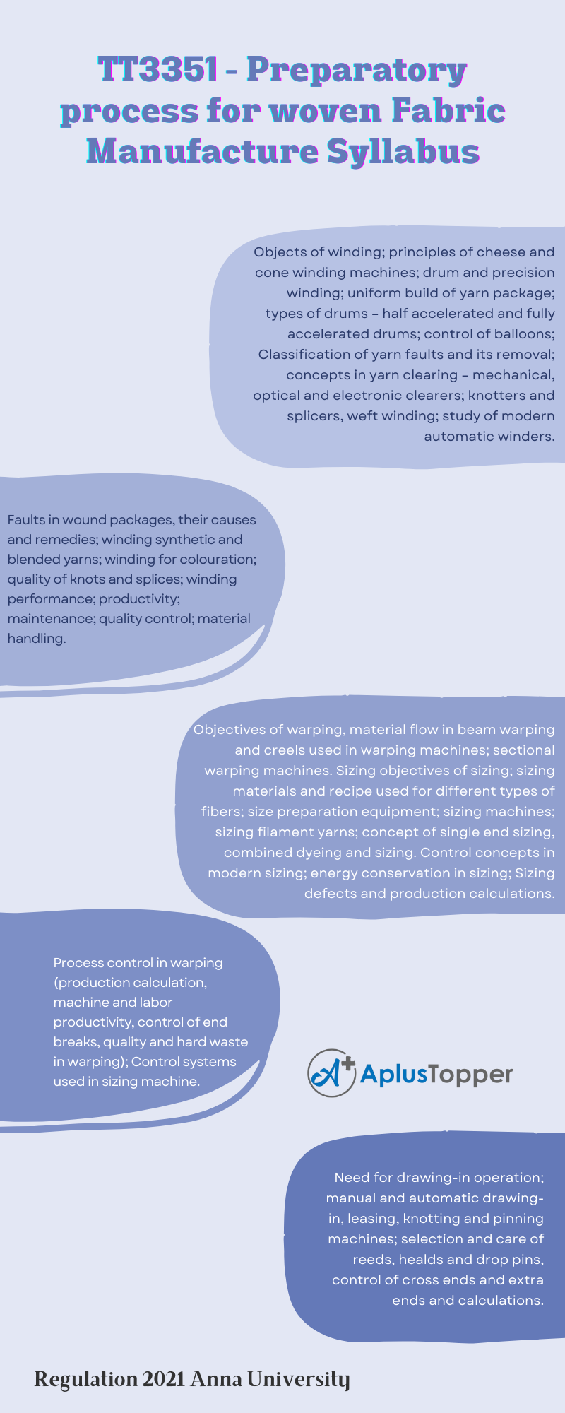 We aim to provide the following semester TT3351 – Preparatory process for woven Fabric Manufacture syllabus in a detailed manner. We include the appropriate syllabus textbooks and references. Hope this information is useful. Don’t forget to share with your classmates.