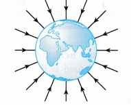 Fig. The book dropped by the boy is pulled towards the Earth - The force of gravity on the Earth is caused by a gravitational field around the Earth. The gravitational field is a region in which an object experiences a force due to the gravitational attraction towards the centre of the Earth. Figure shows the direction of the gravitational field.