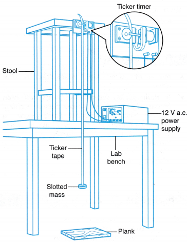 - The ticker timer is switched on and the slotted mass is released so that it falls onto the plank.