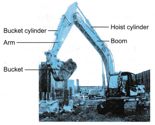 (d) If there is an air bubble in the system, then the pressure applied to the piston in the master cylinder will not be effectively transferred to the slave cylinders as the air bubble is compressible. This will affect the moving of the pistons in the slave cylinders and result in the car not being able to stop or slow down effectively. - A power shovel applies the Pascal’s principle in its operation. Figure shows a power shovel at work. It uses hydraulic cylinders to manipulate its boom and bucket to dig, lift or dump material.