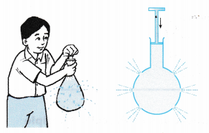 - Figure shows a boy holding a plastic bag with holes. When he squeezes the plastic bag, the water squirts from all the holes in all directions.
